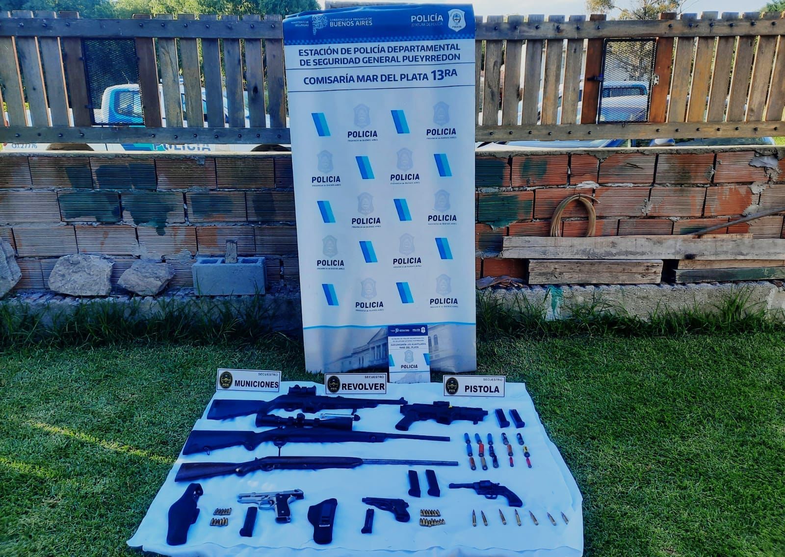 Así, este miércoles personal de la seccional 13 y de la Subcomisaría Acantilados, irrumpieron en una vivienda ubicada a pocas cuadras del complejo mencionado del barrio Alfar. Allí llevaron a cabo la aprehensión de un hombre de 60 años, y realizaron el secuestro de un revólver calibre 38, un fusil de color negro con mira colocada, una pistola con cargador colocado con 10 municiones, una carabina con 2 cargadores 9mm, uno vacío y otro con 15 municiones, una carabina calibre 9 mm con dos cargadores, una mira y una mira láser, una pistola calibre 22 marca Bersa, un cargador vacío y municiones de diferentes calibres.