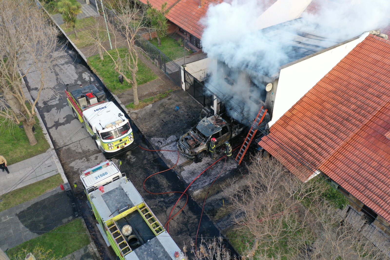 Al llegar, los bomberos se encontraron con un incendio declarado en una vivienda de dos plantas que afectó a la totalidad del inmueble, como así también al vehículo que se encontraba estacionado en el garaje, una camioneta Dodge Ram, que quedó totalmente carbonizada.