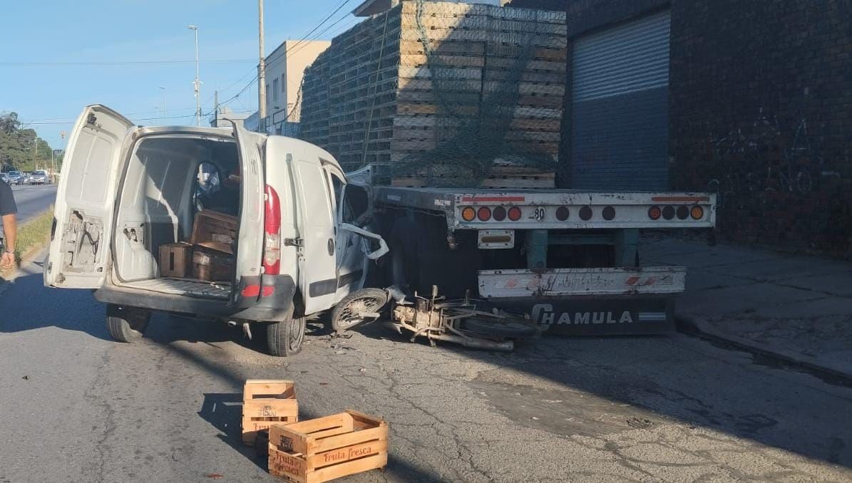 Durante la mañana de este lunes, en la avenida Luro y Venezuela (ex 226) se produjo un siniestro vial. Una camioneta utilitaria Renault Kangoo colisionó contra el acoplado de un camión que se encontraba estacionado y, a su vez, embistió a un hombre que circulaba en en una moto.