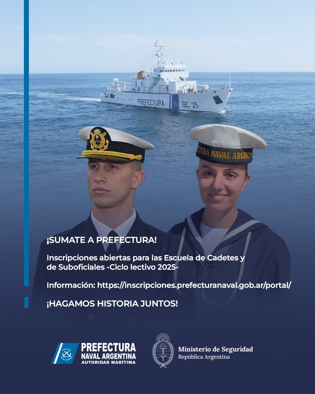La Prefectura Naval Argentina abrió la inscripción a sus Escuelas de Oficiales y Suboficiales para los jóvenes, de ambos sexos, que quieran desarrollar su carrera profesional como oficiales y suboficiales del equipo de la Autoridad Marítima argentina, pudiendo acceder a un título universitario (tras una pasantía en el campo de estudio) o una tecnicatura.
