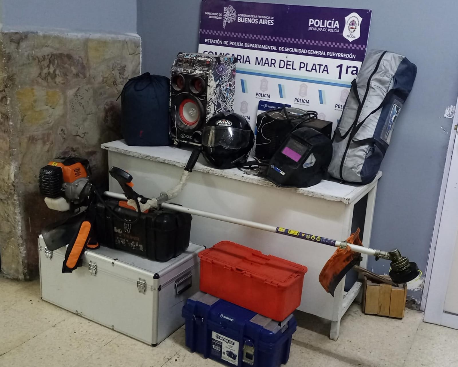 Al llegar, encontraron que el lugar se había violentado el portón de acceso, por lo que los uniformados ingresaron a verificar, y encontrado en el interior de la edificación a dos sujetos que estaban sustrayendo cuatro cajas completas de herramientas, una desmalezadora, un parlante portátil, dos cascos, un cargador de batería y un equipo de camping.