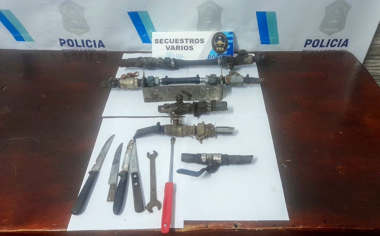 Al darle alcance, realizaron la aprehensión de un hombre de 35 años, quien tenía en su poder una mochila con caños de agua, cuchillos y una llave inglesa.