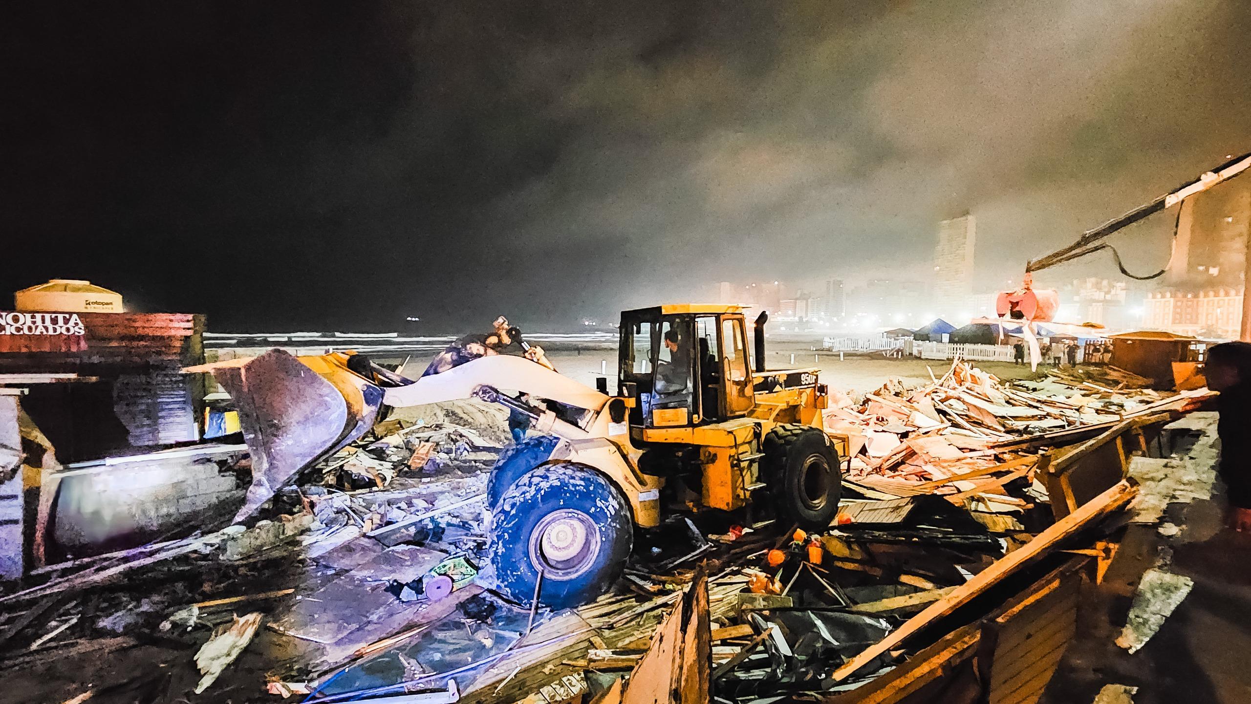 Así fue llegando la madrugada de este jueves, con los puestos vacíos de mercadería, y con el avance de las grúas y topadoras que puso a disposición el Municipio para eliminar todos los puestos y limpiar la zona. Para custodiar el procedimiento también se contó con la presencia de integrantes de la Patrulla Municipal e Infantería, como así también del EMSUR, quienes fueron avanzando con la limpieza de la zona.