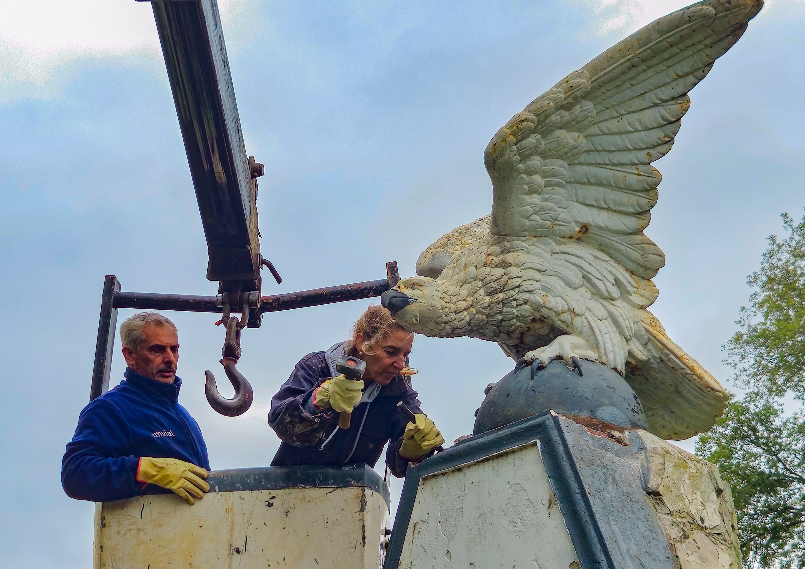 La Municipalidad de General Pueyrredon, a través de la Dirección de Restauración de Monumentos Históricos del Ente de Vialidad y Alumbrado Público (EMVIAL), recuperó la escultura Águila, una obra de gran valor para el patrimonio escultórico de la ciudad.