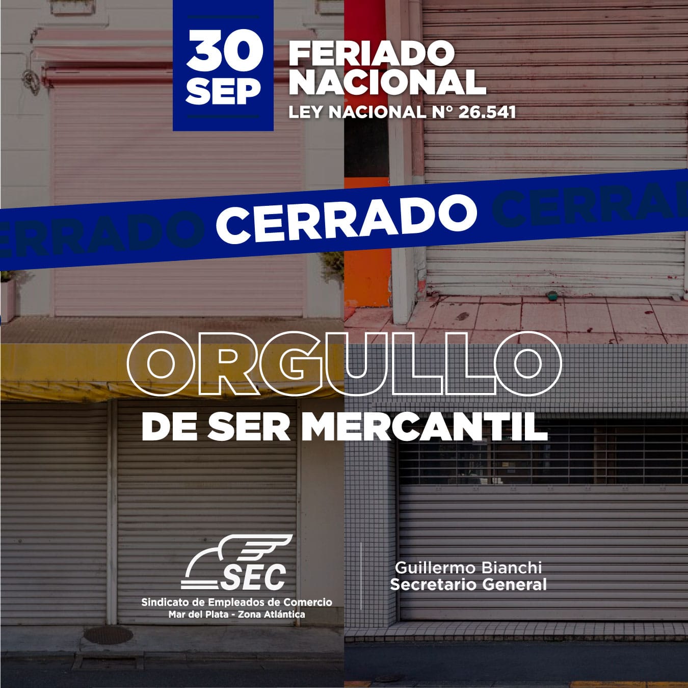 El lunes 30 de septiembre los mercantiles podrán disfrutar su día cómo lo establece la Ley 26.541 que le otorga el carácter de feriado nacional y, por ende, jornada de descanso para los trabajadores del sector. En ese sentido, los locales comerciales permanecerán cerrados.