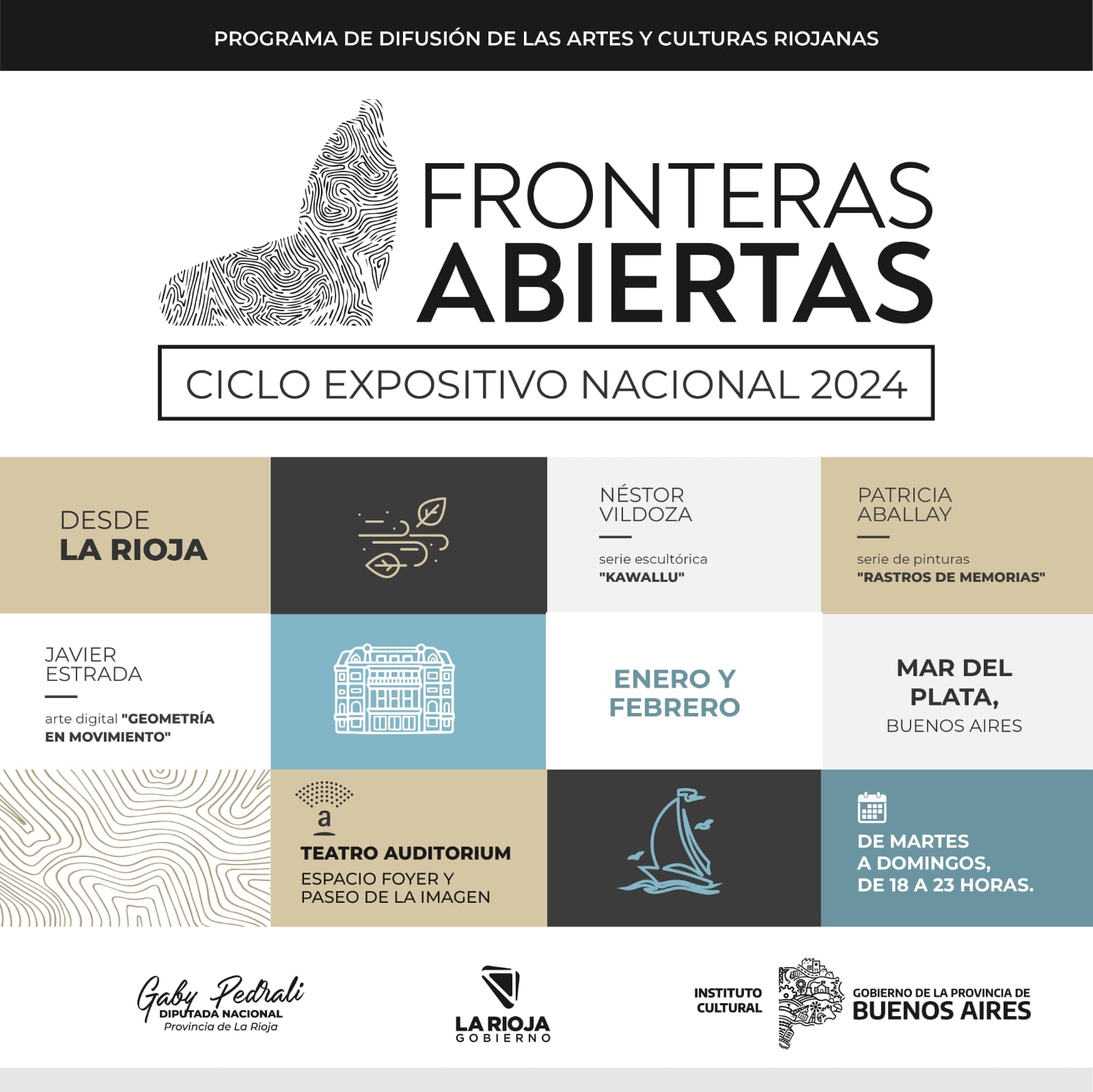 El programa cuenta con el apoyo del Gobierno de La Rioja y trabaja en articulación con el Gobierno de la Provincia de Buenos Aires, mediante su Centro Provincial de las Artes “Teatro Auditorium”. En ese sentido, Gabriela Pedrali impulsora de “Fronteras Abiertas» valoró la oportunidad de llegar a Mar del Plata, un punto turístico estratégico que en esta temporada de verano espera gran afluencia de visitantes de distintos puntos del país y también del exterior. Y agregó, «tenemos muchas expectativas para el inicio de este nuevo ciclo expositivo en una Ciudad que año tras año se posiciona como uno de los principales destinos turísticos de Argentina; para nuestros hacedores y hacedoras culturales será una excelente oportunidad para mostrar sus producciones y para nosotras la posibilidad de seguir consolidando este programa de difusión del arte riojano”.