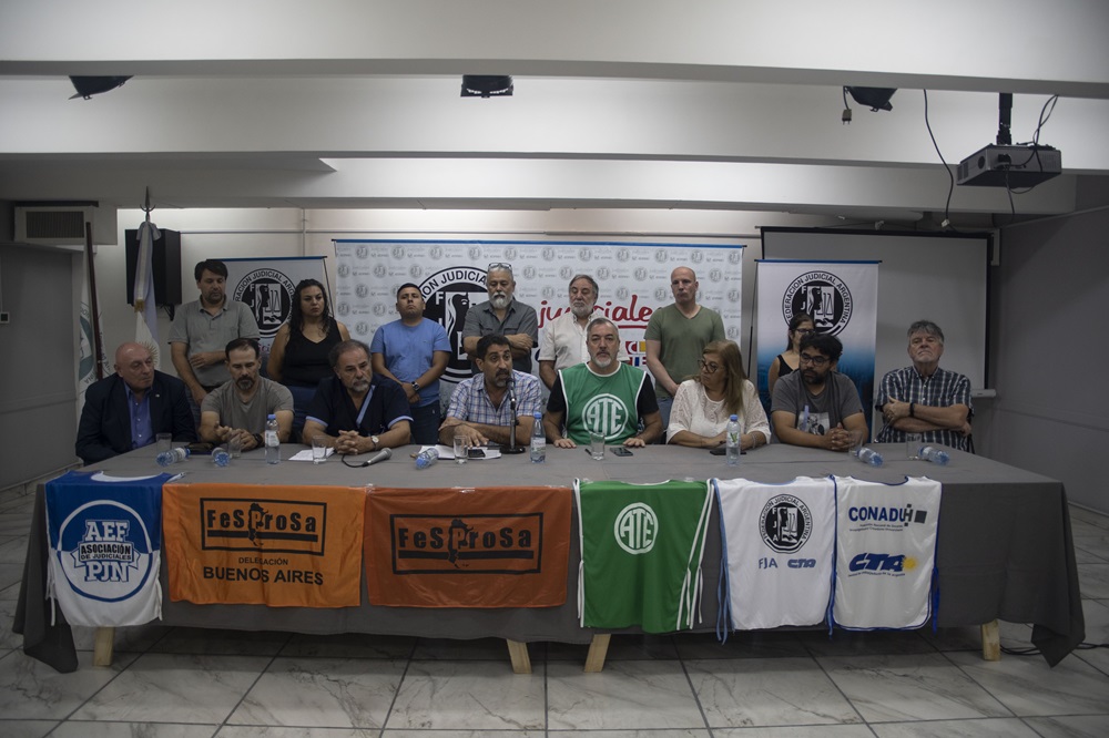 La conferencia, realizada este mediodía en la sede porteña de la FJA ubicada en Rincón 74, fue encabezada por los secretarios Generales de más de una quincena de organizaciones que conforman el Frente, entre ellos, Rodolfo Aguiar (ATE Nacional), Francisca Staiti (Conadu Histórica) y Fachal.