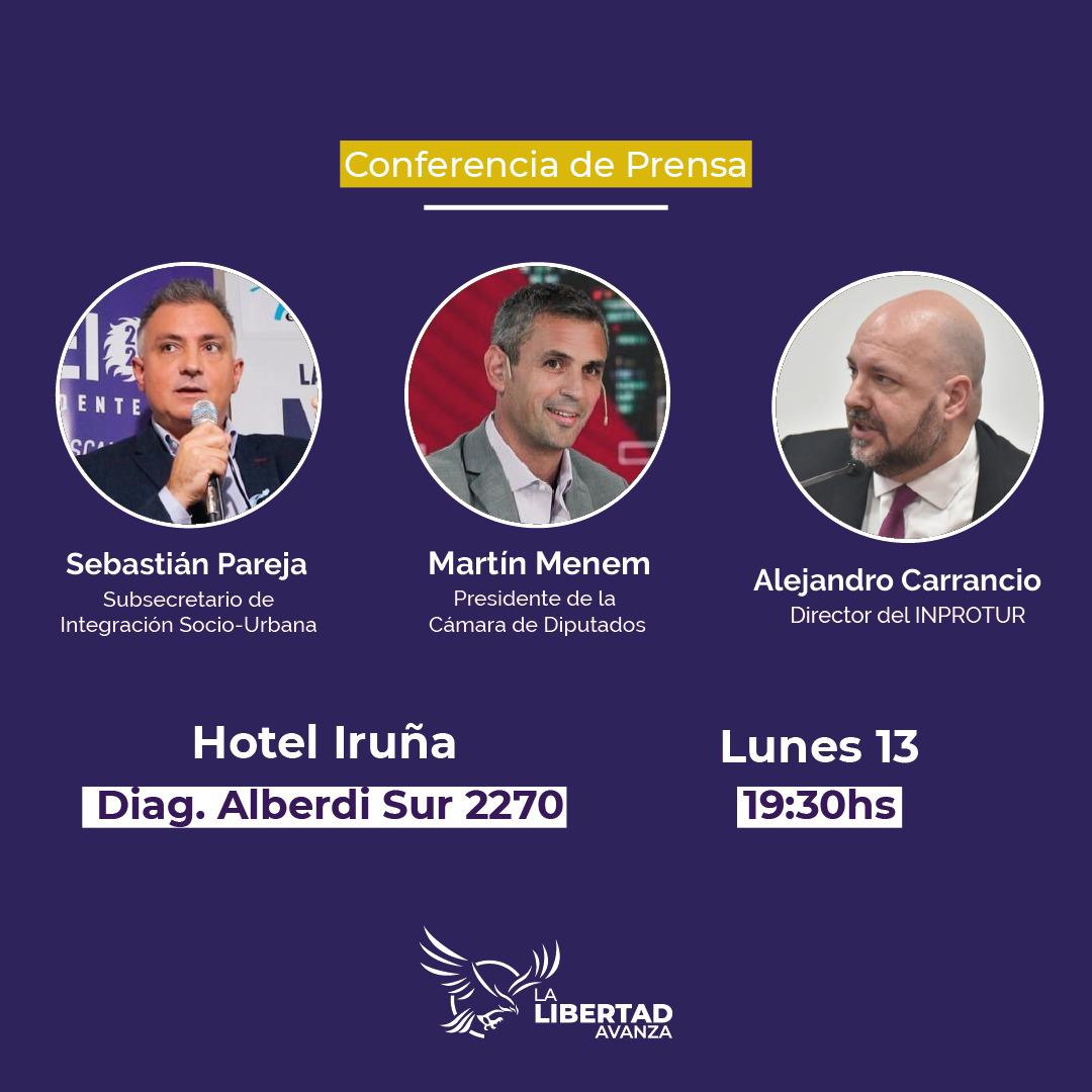 A su vez, Martín Menem, vicepresidente de LLA, ofrecerá una conferencia de prensa junto al titular del partido en la provincia de Buenos Aires, Sebastián Pareja, y el referente local La Libertad Avanza, Alejandro Carrancio.