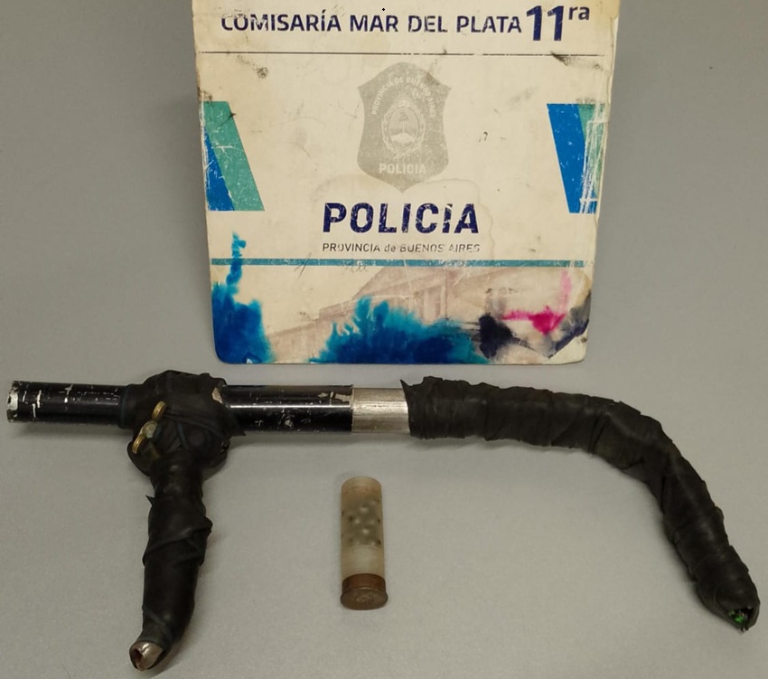 Posteriormente, se constató que en el interior de una mochila portaba un arma de fabricación casera tipo tumbera, de aproximadamente 35 cm de longitud, con doble empuñadura recubierta en goma color negro, apta para el disparo, conteniendo un cartucho calibre 12, por lo que se procedió al secuestro.