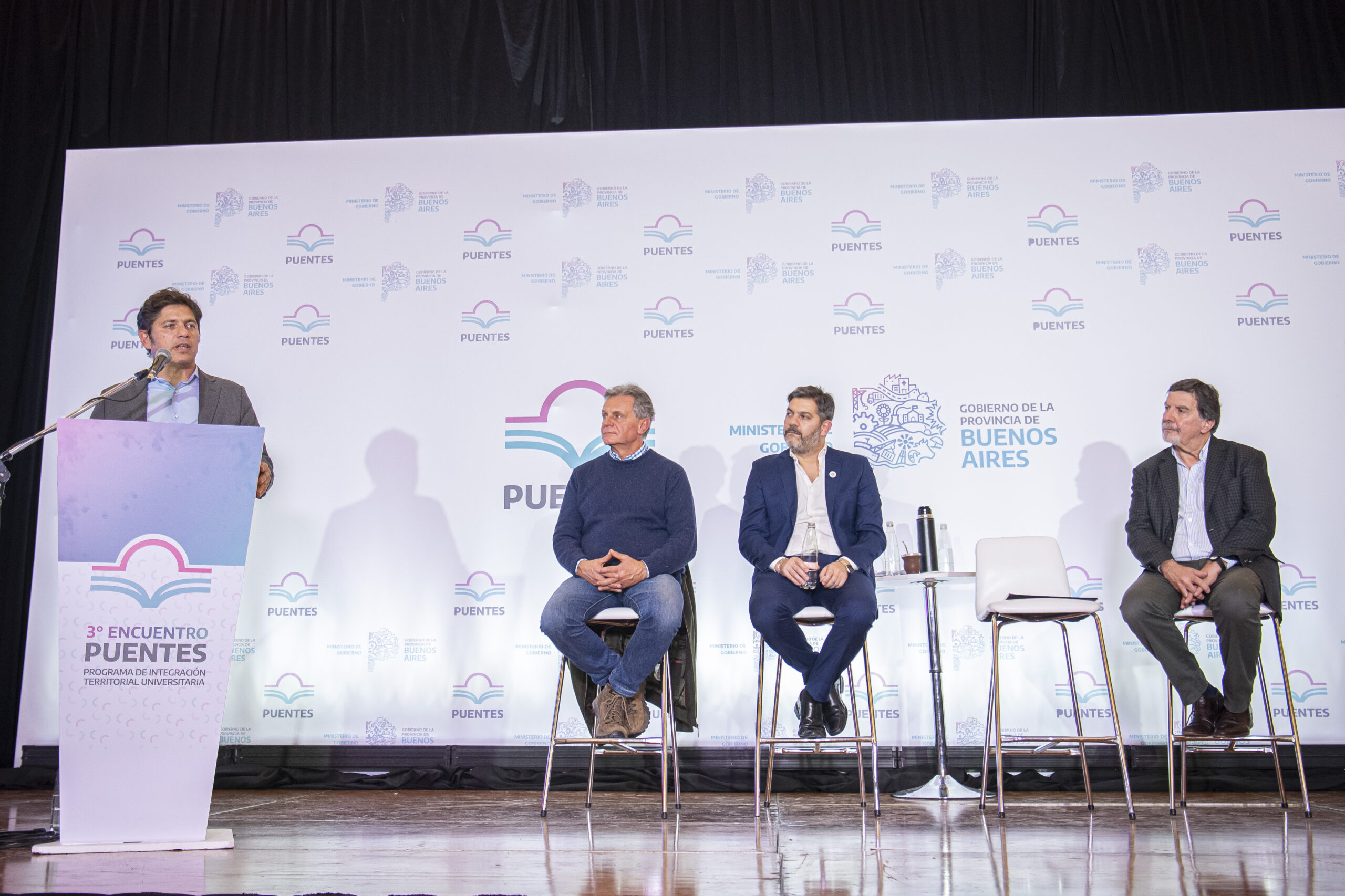 El gobernador de la provincia de Buenos Aires, Axel Kicillof, encabezó este viernes junto al ministro de Gobierno, Carlos Bianco, el panel de cierre del 3° Encuentro Anual del Programa Puentes en el Gran Hotel Provincial de Mar del Plata. Con la presencia del director general de Cultura y Educación, Alberto Sileoni; la jefa de Asesores, Cristina Álvarez Rodríguez, y el diputado Gustavo Pulti, anunció nuevo financiamiento y firmó convenios para ampliar el alcance y la oferta académica del nivel superior en el interior bonaerense. Además, entregó más equipamiento para la prevención del delito.