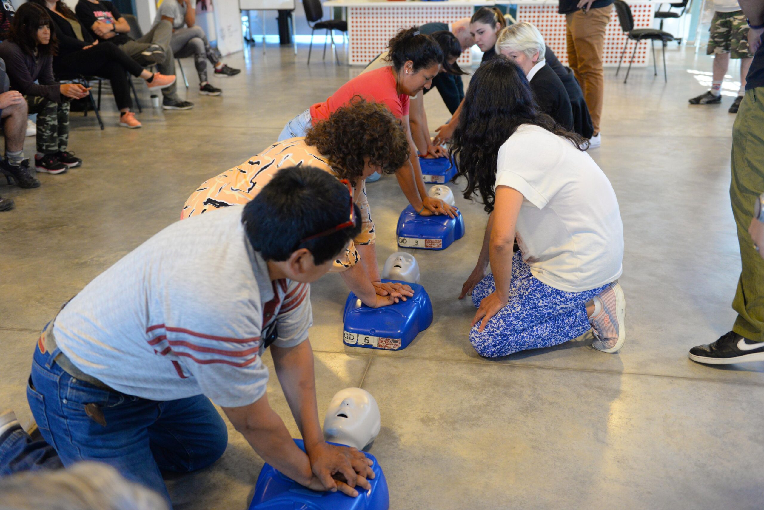 La fase práctica se divide en estaciones de trabajo, cada una con un instructor a cargo. Los cursantes realizan las maniobras sobre muñecos de simulación y aprenden el correcto uso de los DEA (Desfibrilador externo automático) a través del ejercicio en simuladores.