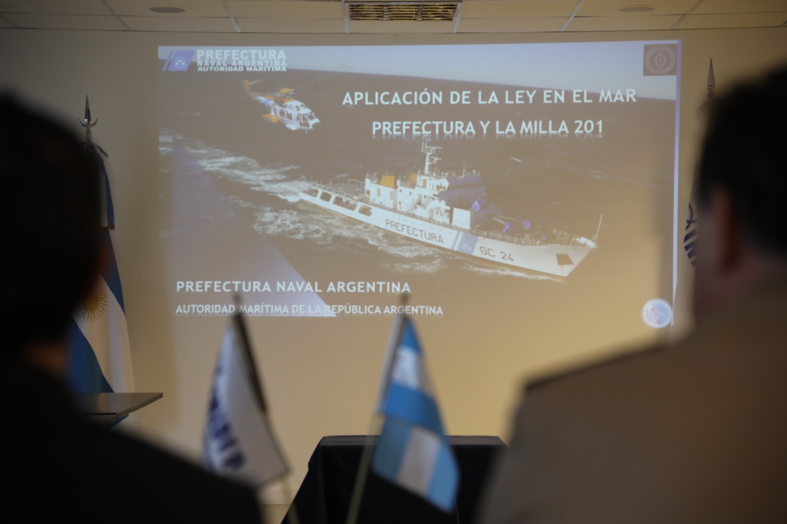 La primera disertación del encuentro estuvo a cargo de la Prefectura y se centró en el rol que tiene la Fuerza como autoridad encargada de aplicar la ley en el mar, que incluye una amplia gama de tareas vinculadas al control de los espacios marítimos argentinos.