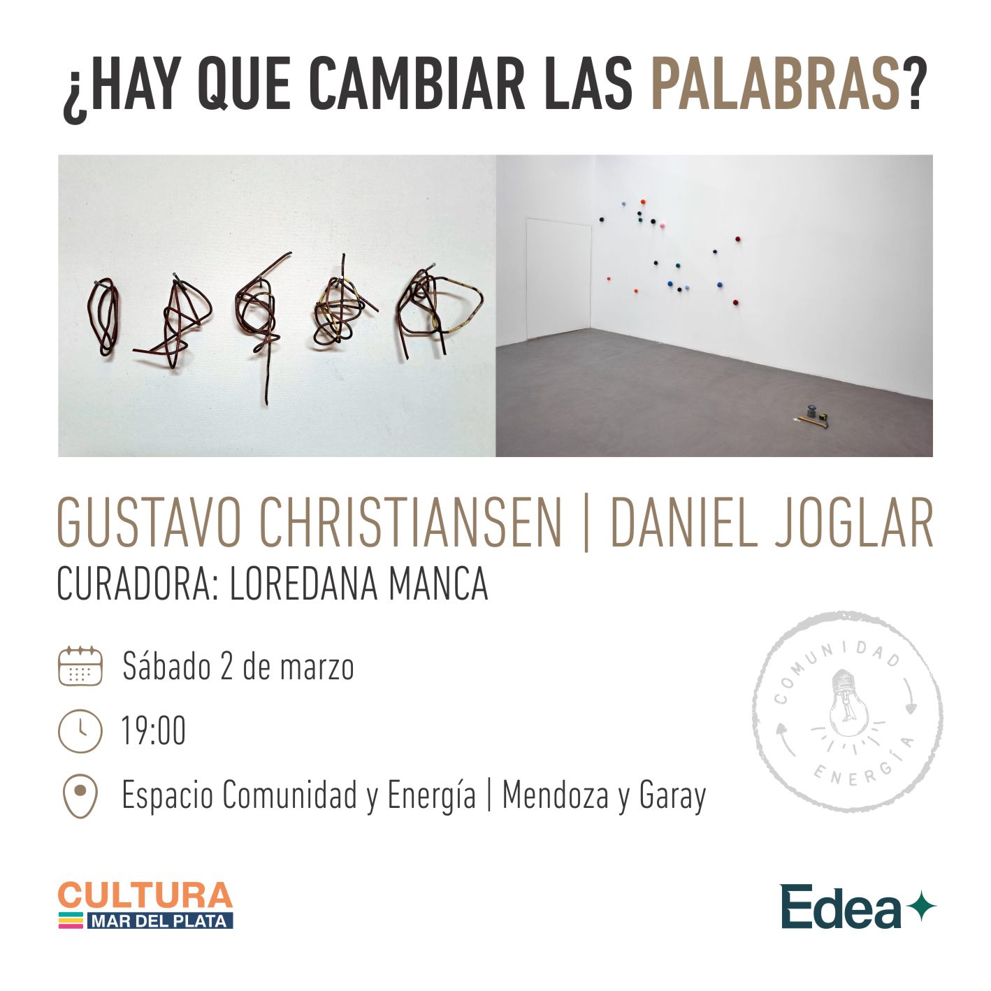 Bajo la curaduría de Loredana Manca y en el marco del 150 aniversario de Mar del Plata, la exposición que lleva por título ¿Hay que cambiar las palabras? se extenderá durante todos los fines de semana de marzo, con entrada libre y gratuita, en el espacio que EDEA pone a disposición sin cargo para la realización de iniciativas culturales en esta ciudad.