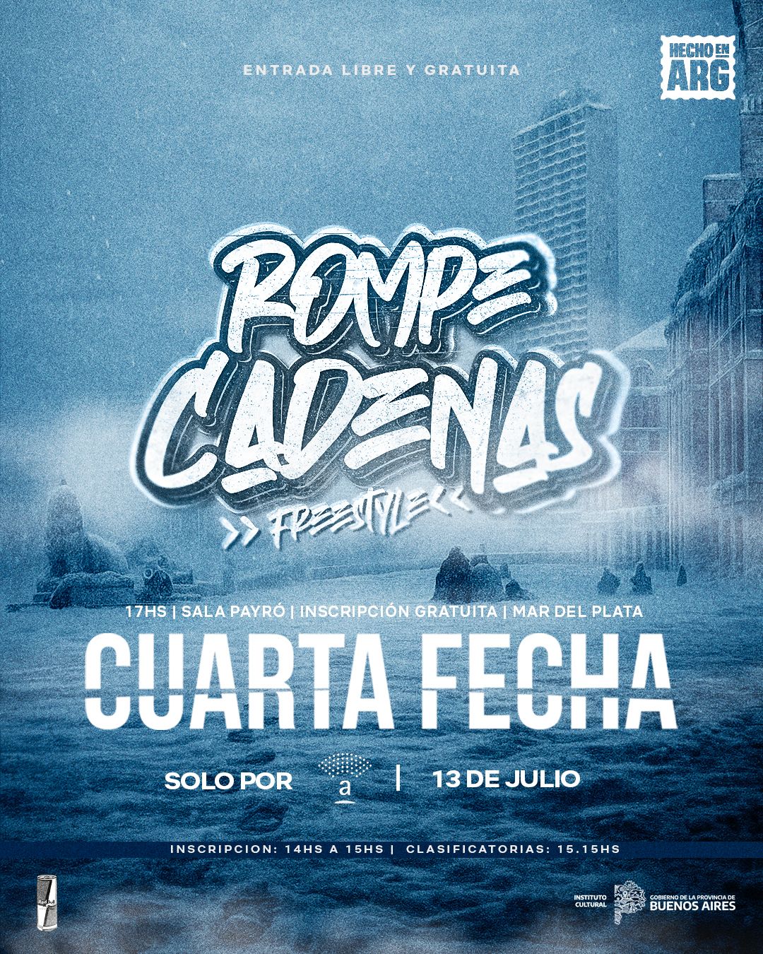 El próximo domingo 13 de julio se llevará a cabo una nueva fecha del torneo de freestyle “Rompe Cadenas”. La competencia de freestyle más importante de la Provincia de Buenos Aires, que lleva adelante su ciclo en la Sala Payró del Teatro Auditorium por cuarto año consecutivo, y va camino a la quinta Final Nacional en la Sala Piazzolla.
