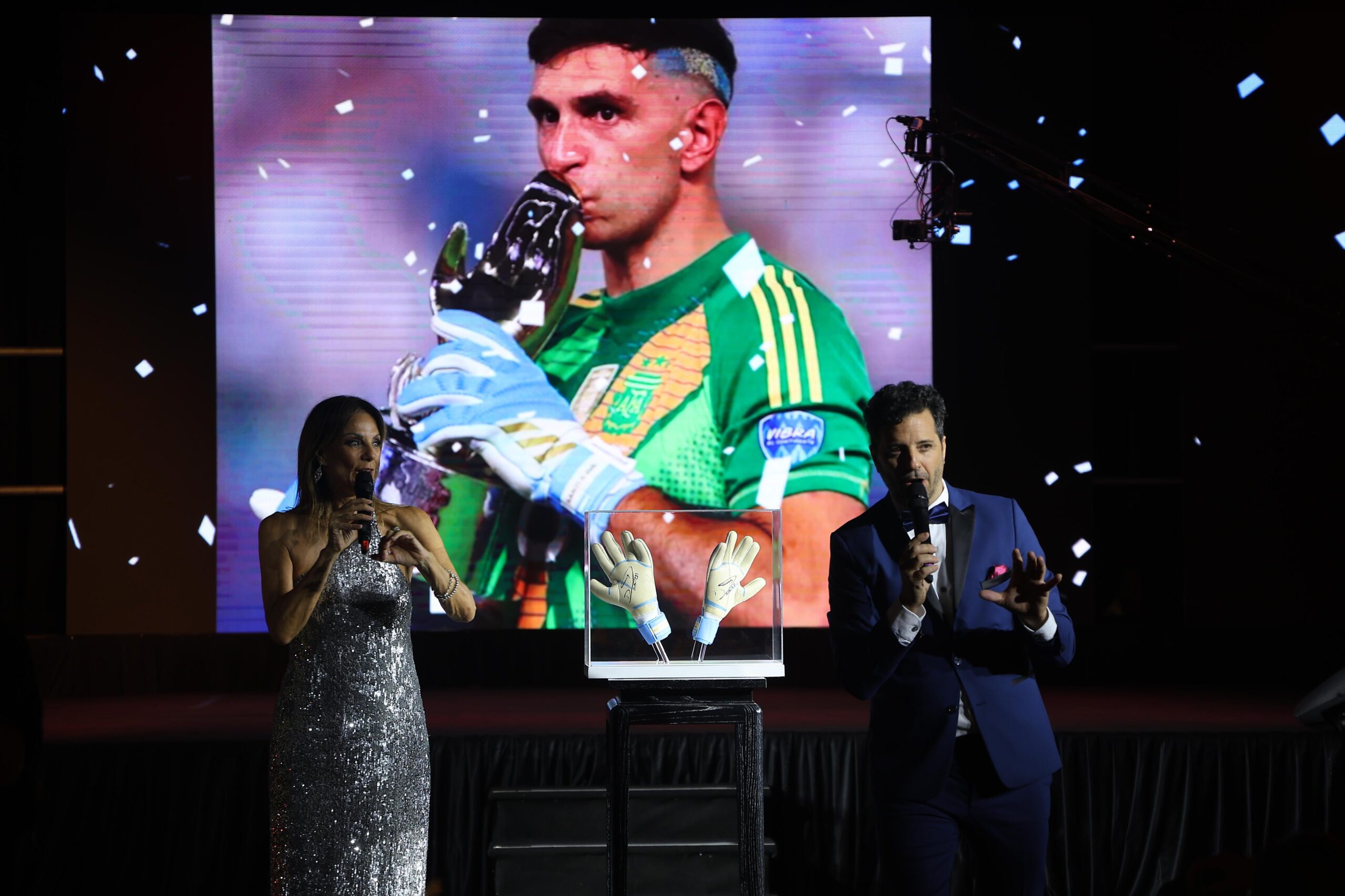 El momento más importante de la noche se dio cuando se subastaron los guantes autografiados de Emiliano “Dibu” Martínez alcanzando la suma de 100.000 dólares. El arquero de la Selección Argentina de Fútbol tiene un vínculo muy especial con este hospital porque nació allí el 2 de septiembre de 1992. Por ese motivo, volvió a estar presente en la gala anual a través de la donación de algunas de sus prendas. En esta oportunidad, los guantes que usó durante la final de la última Copa América donde Argentina salió campeón. Entre 5 empresarios donaron cada uno 20.000 dólares para lograr la recaudación final de 100.000 dólares. Quienes tuvieron esta generosa iniciativa fueron: Marcelo González (Teatro Tronador), Luis Terri (Norgreen), Marcelo Cardelino (Open Sports), Daniel Otero (Lucciano´s), Manuel Sánchez (Acoplados Sánchez). El papá del Dibu, Beto Martínez, fue el encargado de entregar los guantes y de contar con orgullo a todos los presentes que Dibu había nacido en este hospital.