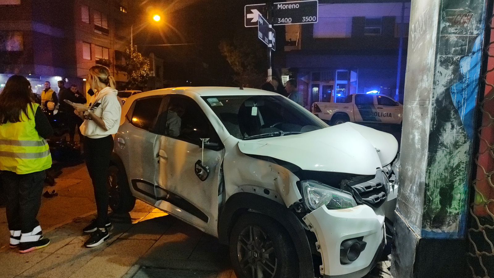 Durante la medianoche de este martes, en Moreno y Jujuy se produjo una colisión entre un Renault Kwid y una motocicleta Honda Nighthawk, funcionando como móvil de Tránsito Municipal.