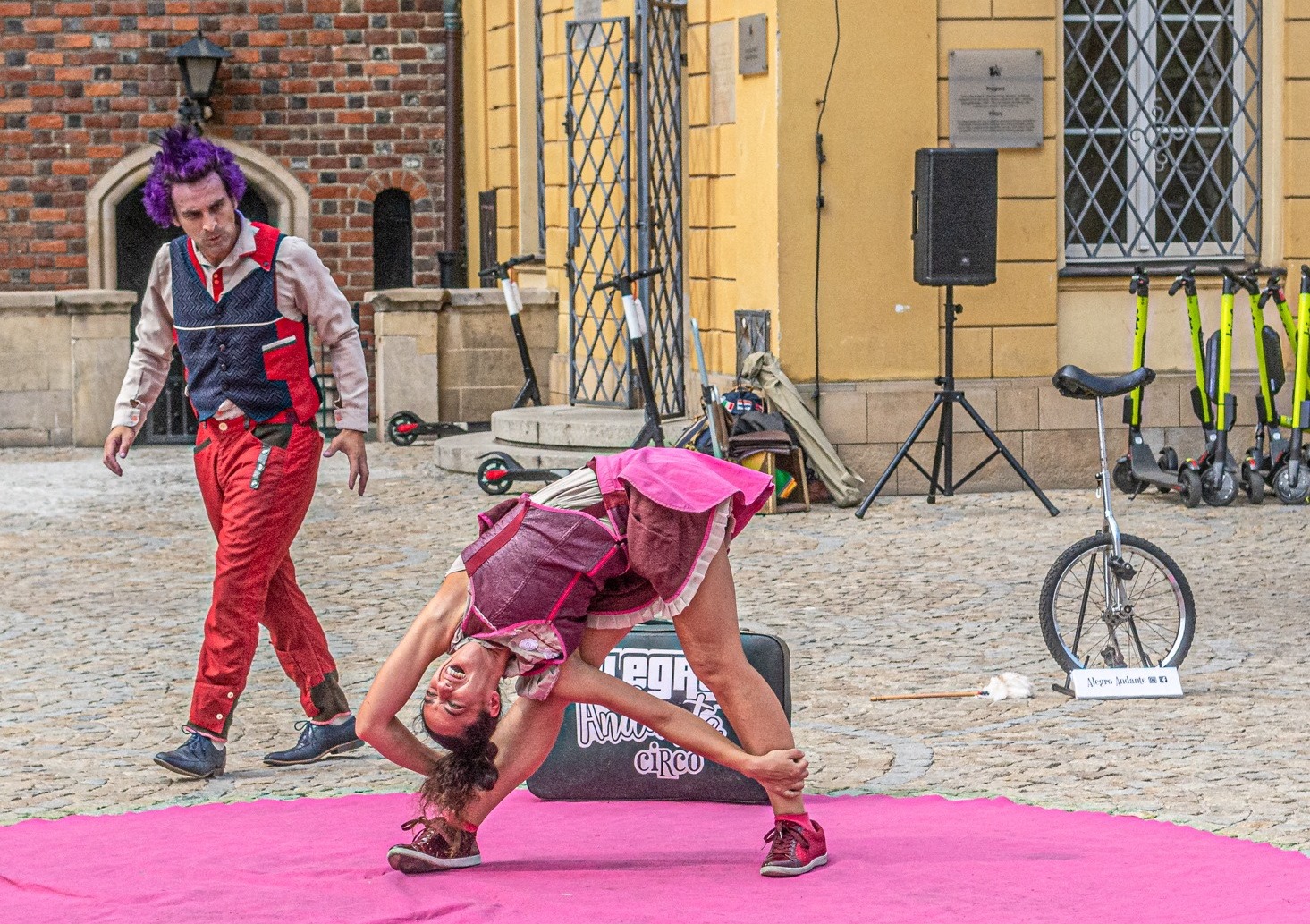 Equilibristas, malabaristas, acróbatas, payasos, magos, bailarines, clowns, contorsionistas que demostrarán su talento llevando a cabo los más espectaculares trucos con monociclos, diábolos, trompos, clavas, cuerdas, zancos, clavas con fuego, aros, látigos y números sorpresivos.